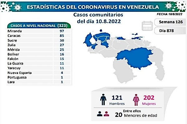 Informó que los casos comunitarios fueron ubicados en los estados Miranda 97, Caracas 85, Sucre 30, Zulia 27, Mérida 25, Bolívar 16, Falcón 15, La Guaira 11,Yaracuy 11, Nueva esparte 4. Portuguesa 1, Lara 1.