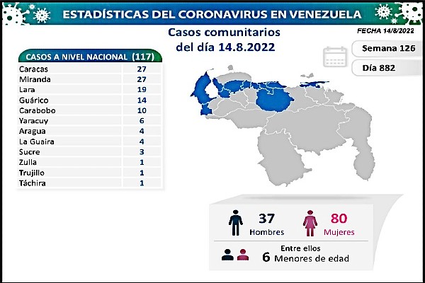Informó que los casos comunitarios están ubicados en los estados: Caracas (27), Miranda (27), Lara (19), Guárico (14), Carabobo (10), Yaracuy (6), Aragua (4), La Guaira (4), Sucre (3), Zulia (1), Trujillo (1) y Táchira (1).