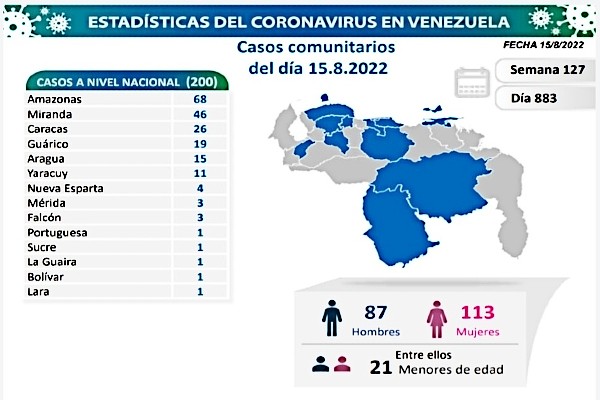 A 883 días de la pandemia, Venezuela reportó este lunes 15 de agosto 200 nuevos contagios por covid-19, todos por transmisión comunitaria.
