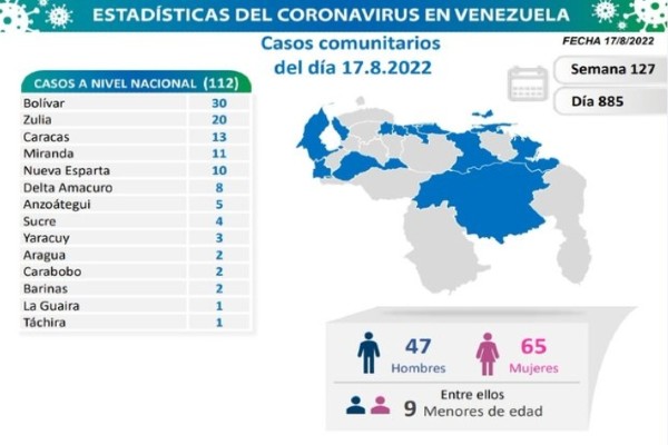 Informó que los casos comunitarios están ubicados en los estados: Bolívar (30), Zulia (20), Caracas (13), Miranda (11), Nueva Esparta (10), Delta Amacuro (8), Anzoátegui (5), Sucre (4), Yaracuy (3), Aragua (2), Carabobo (2), La Guaira (1) y Táchira (1).