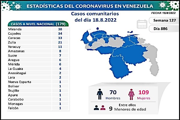 La Comisión Presidencial para la Prevención, Atención y Control de la #COVID19 informa que en las últimas horas se detectaron 181 nuevos contagios en Venezuela: 179 por transmisión comunitaria y 2 importados»; fue el primer mensaje que colgó la vicepresidenta Delcy Rodríguez, en su cuenta de Twitter, cerca de la medianoche del jueves 18 de agosto.