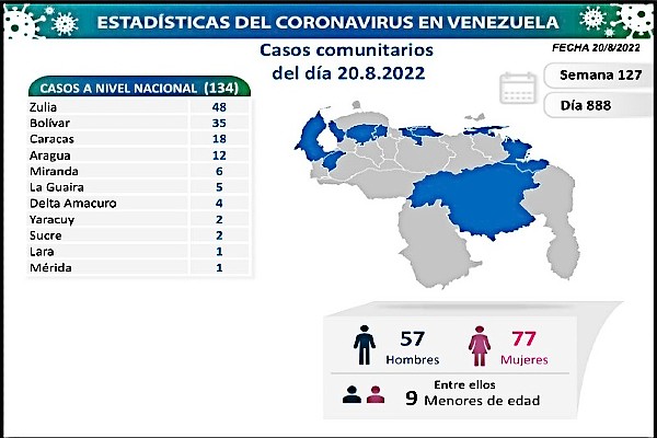 Informó que los casos comunitarios están ubicados en los estados: Zulia (48), Bolívar (35), Caracas (18), Aragua (12), Miranda (6), La Guaira (5), Delta Amacuro (4), Yaracuy (2), Sucre (2), Lara (1), Mérida (1).