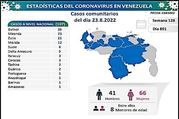 Informó que los casos comunitarios están ubicados en los estados: Bolívar (26), Miranda (23), Zulia (21) y Mérida (12),Sucre (6), Delta Amacuro (5), Yaracuy (3), Caracas (3), Táchira (2), Guárico (2) y Potuguesa, Anzoátegui, Barinas y Amazonas con (1) caso cada uno.