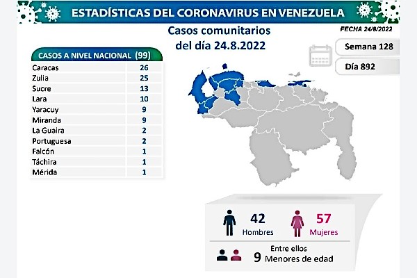 Informó que los casos comunitarios están ubicados en La ciudad de Caracas que encabeza la lista con 26 casos, seguida de Zulia con 25, Sucre 13, Lara 10, Yaracuy 9, Miranda 9, La Guaira y Portuguesa 2 cada una. Finalmente, Falcón, Táchira y Mérida con 1 caso.