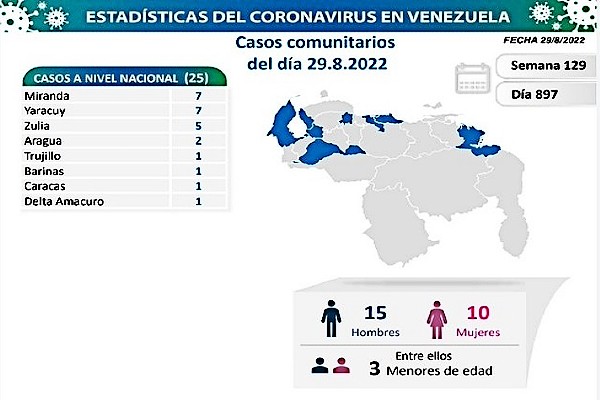 A 897 días de pandemia en Venezuela, anunciamos que durante las últimas 24 horas el país registró 29 casos, 25 por transmisión comunitaria y 4 casos importados, así lo dijo el Vicepresidente Sectorial de Comunicación, Turismo y Cultura, Freddy Ñáñez, a través de su cuenta de twitter @luchaalmada.