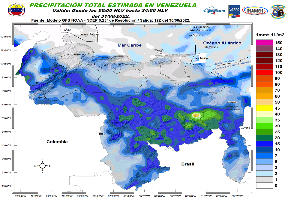 31 de agosto de 2022.- El Instituto Nacional de Meteorología e Hidrología (Inameh) prevé para este día cielo parcialmente nublado con posibles precipitaciones dispersas en gran parte de Venezuela.