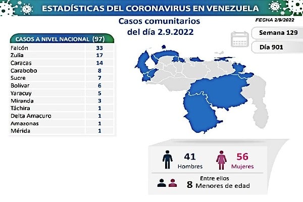 El Ministro de Comunicación e Información, Freddy Ñáñez informó en su red social de twitter @luchaalmada: A 901 días de la pandemia en Venezuela, anunciamos que durante las últimas 24 horas el país registró 97 casos, todos por transmisión comunitaria.