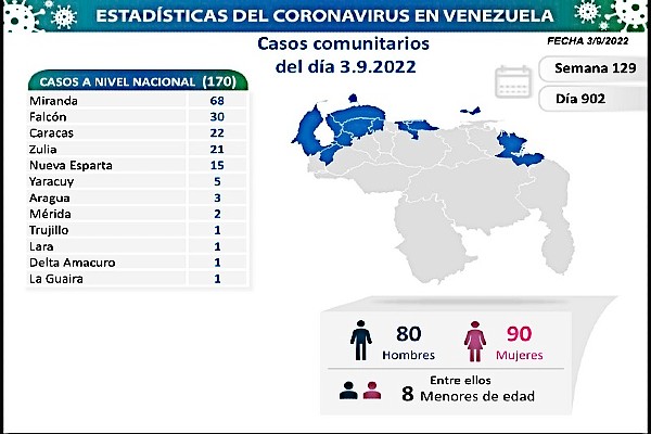 En el día 902 de la pandemia por la covid-19 en Venezuela, se reportaron 170 nuevos casos, por transmisión comunitaria. Así lo informó la vicepresidenta ejecutiva de la República y presidenta de la Comisión para la Prevención, Atención y Control de la covid-19, Delcy Rodríguez, a través de su cuenta en Twitter.