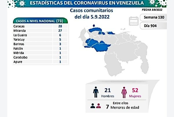 A 904 días de la pandemia en Venezuela, la administración de Nicolás Maduro reportó 73 casos de Covid-19 durante las últimas 24 horas, todos por transmisión comunitaria, así lo indicó el Vicepresidente Sectorial de Comunicación, Turismo y Cultura, Freddy Ñáñez, en su cuenta de twitter @luchaalmada.