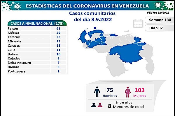 El estado Falcón fue la entidad que registró más nuevos casos comunitarios (61), con contagios activos en 5 municipios; seguido por los siguientes estados: Mérida (29), Yaracuy (22) y Miranda (13).