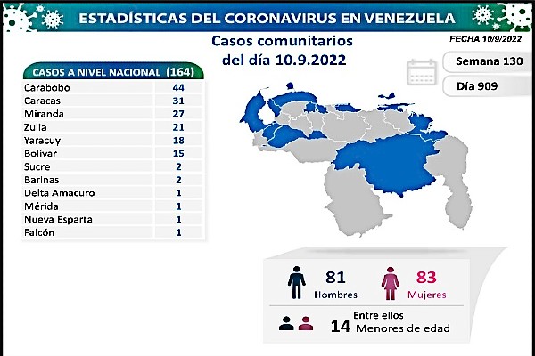 Informó que los casos comunitarios están ubicados en los estados: Carabobo (44), Caracas (31), Miranda (27) y Zulia (21), Yaracuy (18), Bolívar (15), Sucre y Barinas (2C/U), Delta Amacuro, Mérida, Nueva Esparta y Falcón (1C/U).