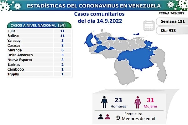 Este miércoles 14 de septiembre Venezuela cumplió el día 913 de pandemia de la covid-19. El vicepresidente sectorial de Comunicación, Información y Cultura informó en su cuenta Twitter que en las últimas 24 horas el país registró 57 casos: 54 por transmisión comunitaria y 3 importados.
