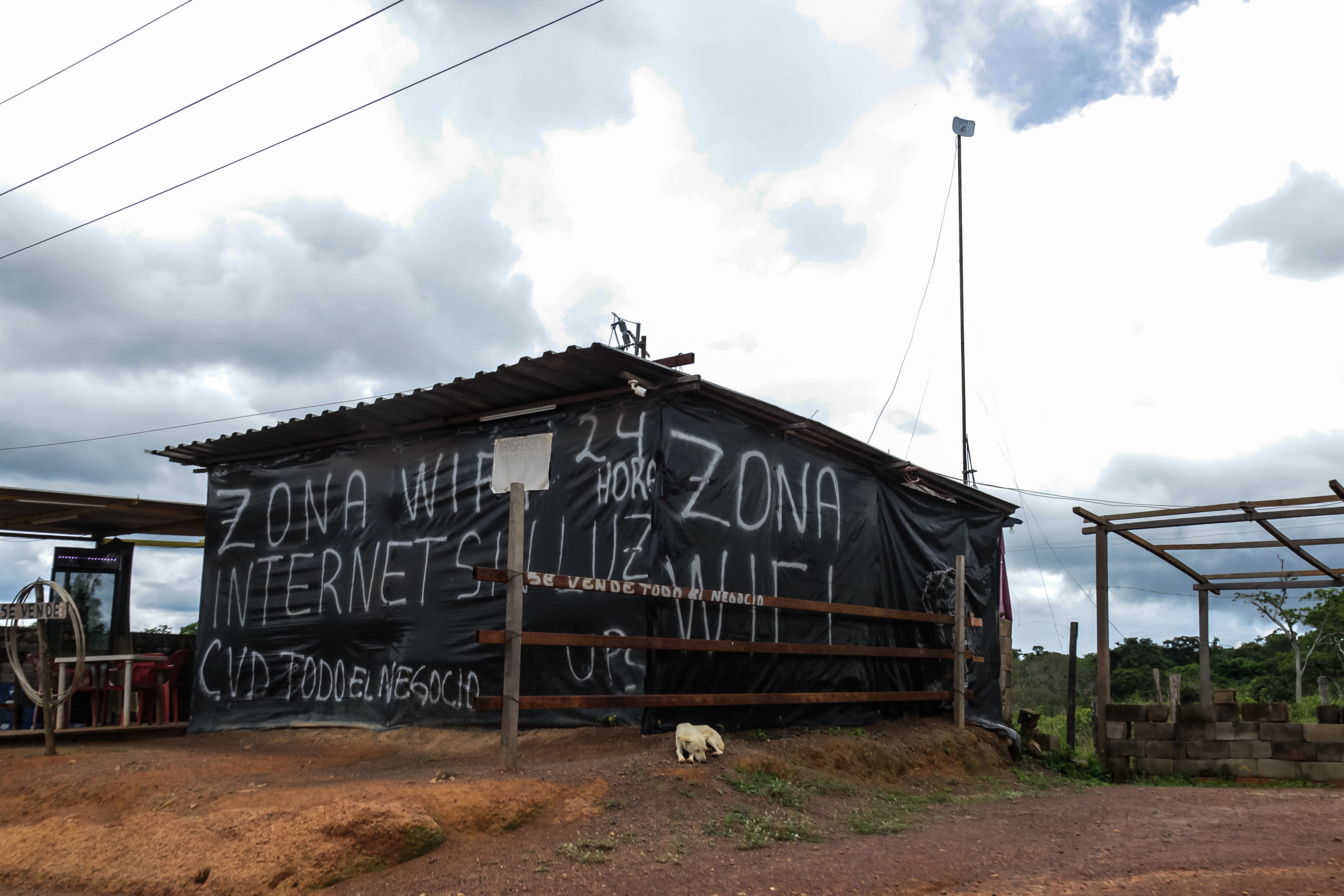 Al amanecer estallan los colores de la devastación minera. A lo largo de la principal arteria vial del Arco Minero del Orinoco, en terrenos donde alguna vez hubo árboles y gramíneas, ahora quedan barriales, hoyos y charcos. Pululan los letreros y muros con rótulos de empresas desconocidas al mismo tiempo que se instalan nuevas plantas de cianuración y molinos artesanales para procesar el oro. Los ríos Yuruari y el Cuyuní, que circundan los poblados mineros, pasaron a ser canales de sedimentos arcillosos. Niños y adolescentes piden propinas a los transeúntes para bachear la carretera que perdió por completo el asfalto en algunos de sus tramos. Sobre la deteriorada ruta, containers con víveres de Brasil y camiones que transportan toneladas de arenas auríferas hasta los complejos industriales, dejan en el aire una bruma espesa que dificulta la respiración. Mineros artesanales, que cargan a sus espaldas bateas de madera para cernir el metal dorado, caminan al borde de la vía rumbo a algún barranco o mina a cielo abierto bajo el control de bandas criminales conocidas en la región como sindicatos o sistemas. Hileras de casuchas con paredes de plástico y cartón piedra, que venden desde empanadas chiclosas, gasolina en botellas plásticas de refresco hasta minutos de internet satelital en una región sin conexión ni telefonía local, se suman a los crecientes poblados improvisados que se extienden por el paisaje.
