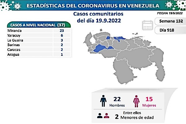 El ministro de Comunicación e Información, Freddy Ñáñez, en su cuenta de Twitter @luchaalmada, informó que A 918 días de la pandemia en Venezuela, comunicamos que durante las últimas 24 horas el país se registraron 38 nuevos contagios por #Covid19, 37 de transmisión comunitaria y 1 importado.