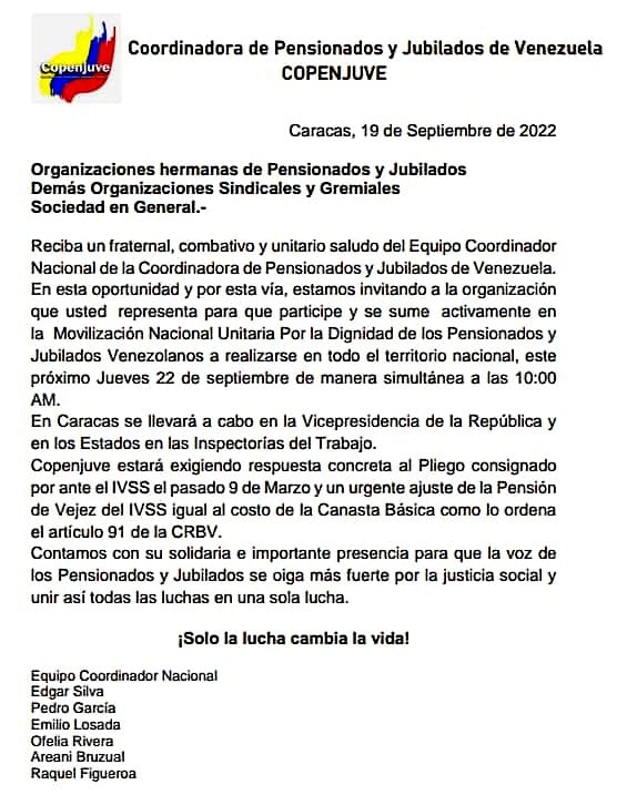 La Coordinadora de Pensionados y Jubilados de Venezuela (COPENJUVE) convocó, a traves del comunicado siguiente que reproducimos, a la Movilización Nacional Unitaria de Pensionados y Jubilados de Venezuela pautada para este Jueves 22 de Septiembre alas 10:00 AM y de manera simultanea en todos los Estados del país: