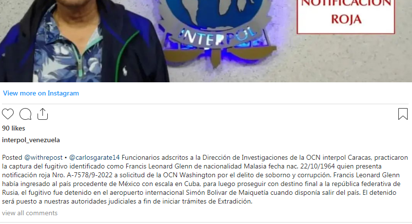 «Francis Leonard Glenn ingresó al país procedente de México con escala en Cuba. Para luego proseguir con destino final a la República Federativa de Rusia. El fugitivo fue detenido en el Aeropuerto Internacional Simón Bolívar de Maiquetía cuando se disponía a salir del país«, publicó Interpol Venezuela en su cuenta.