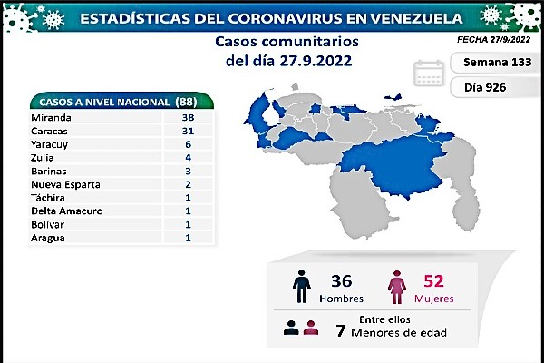 Informó que los casos comunitarios están ubicados en los estados: Miranda (38), Caracas (31), Yaracuy (6), Zulia (4), Barinas (3), Nueva Esparta (2), Táchira, Delta Amacuro, Bolívar y Aragua (1 c/u).