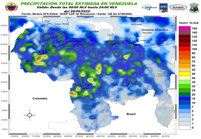 28 de septiembre de 2022.- El Instituto Nacional de Meteorología e Hidrología (Inameh) prevé para este día lluvias, lloviznas aisladas y chubascos en gran parte de Venezuela.