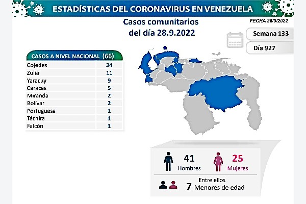 Los casos comunitarios son 41 hombres y 25 mujeres, entre ellos 7 menores de edad, Se distribuyen en 9 estados: Cojedes 34, Zulia 11, Yaracuy 9, Caracas 5, Miranda 2, Bolívar 2, Portuguesa 1, Táchira 1 y Falcón 1.