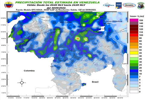 30 de septiembre de 2022.- El Instituto Nacional de Meteorología e Hidrología (Inameh) prevé este día lluvias y chubascos, descargas eléctricas y eventuales ráfagas de viento en la mayor parte de Venezuela.