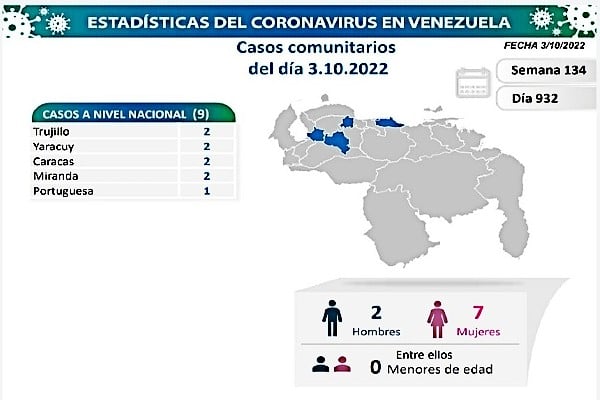 La comisión presidencial a través del vicepresidente de Comunicación, Cultura y Turismo, Freddy Ñáñez informó que a 932 días de la pandemia por covid-19 en Venezuela se registraron 10 casos, 9 por transmisión comunitaria y 1 caso importado.
