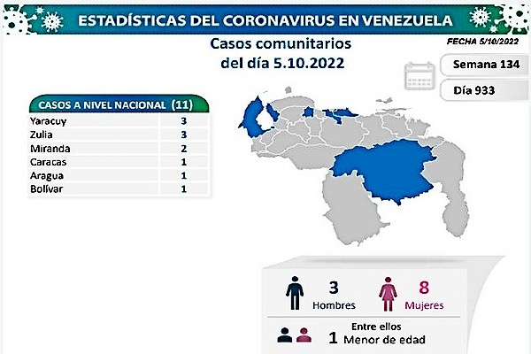 Este miércoles 5 de octubre Venezuela cumplió el día 933 de pandemia de la covid-19. El vicepresidente sectorial de Comunicación, Cultura y Turismo, Freddy Ñáñez, informó a través de su cuenta en Twitter, que en las últimas 24 horas el país registró apenas 11 casos, todos por transmisión comunitaria.