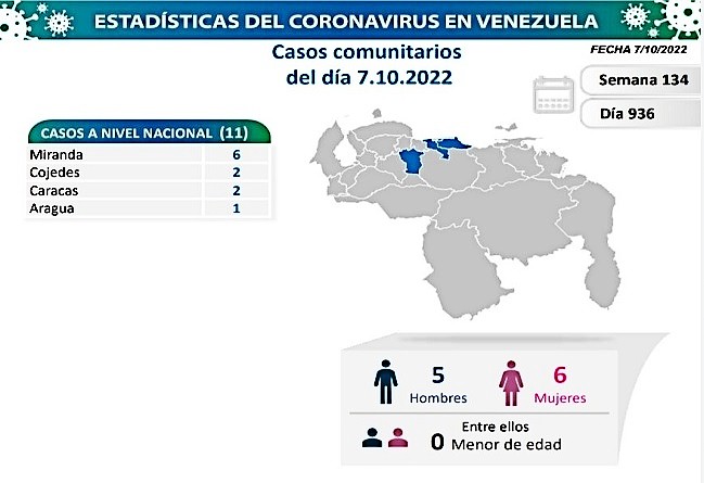 Se indicó que los casos comunitarios están ubicados en los estados: Miranda 6, Cojedes 2, Caracas 2 y Aragua 1.