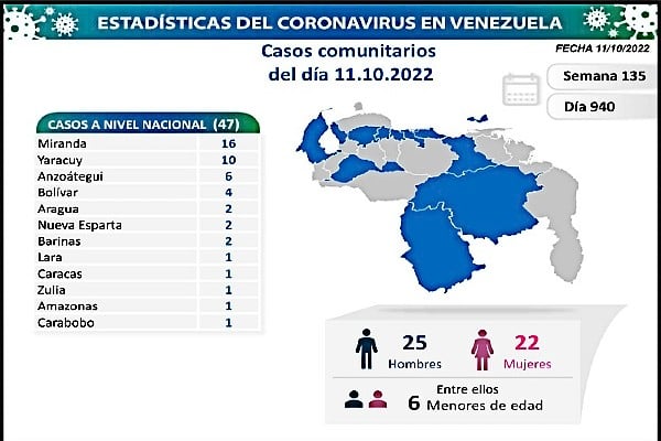 Este martes en el día 940 de pandemia en Venezuela, la Comisión Presidencial para la Prevención, Atención y Control de la covid-19 informa que en las últimas horas se registraron 47 nuevos contagios en el territorio nacional.