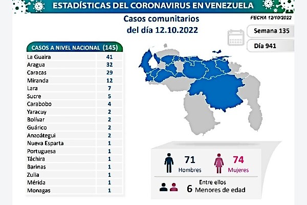 A 941 días de la pandemia en Venezuela, informamos que durante las últimas 24 horas el país registró 146 casos, 145 casos comunitarios y 1 importado»; fue el primer mensaje que colgó el ministro de Comunicación, Freddy Ñáñez en su cuenta de Twitter.