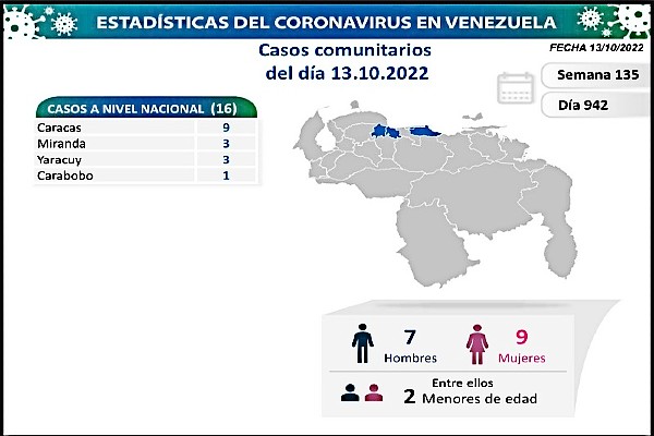 Informó que los casos comunitarios están ubicados en los estados: Caracas (9), Miranda (3), Yaracuy (3) y Carabobo (1).