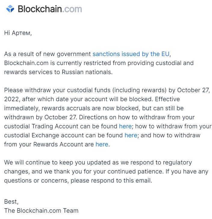 Blockchain.com es la primera wallet (billetera digital) que envía un correo electrónico a sus usuarios en Rusia notificando que tienen hasta el próximo 27 de octubre para retirar sus fondos.