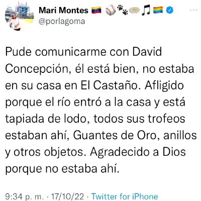Poco después de las inundaciones, la periodista Mari Montes en su cuenta de la red social Twitter, escribió: "Pude comunicarme con David Concepción; él está bien, no estaba en su casa en El Castaño. Afligido porque el río entró a la casa y está tapiada de lodo, todos sus trofeos estaban ahí, Guantes de Oro, anillos y otros objetos. Agradecido a Dios porque no estaba ahí".