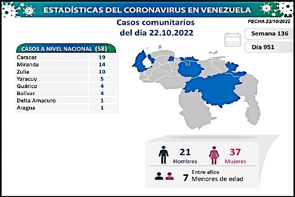 Informó que los casos comunitarios están ubicados en los estados: Caracas (19), Miranda (14), Zulia (10) y Yaracuy (5), Guárico y Bolívar con (4 c/u) y Delta Amacuro y Aragua con (1 c/u).