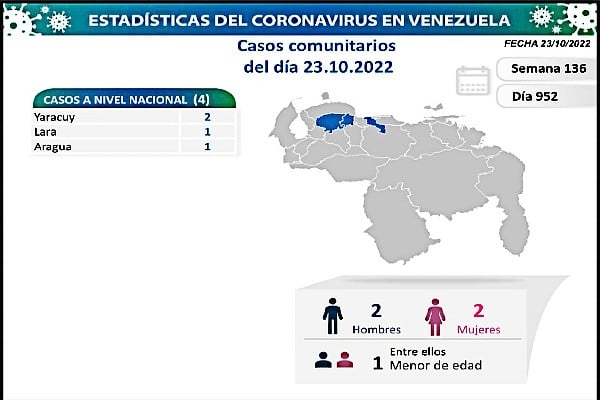 El estado que este 23 de octubre registra el mayor número de nuevos casos comunitarios fue Yaracuy con apenas (2), con contagios activos en 1 municipio; seguido por las entidades: Lara (1) y Aragua (1).