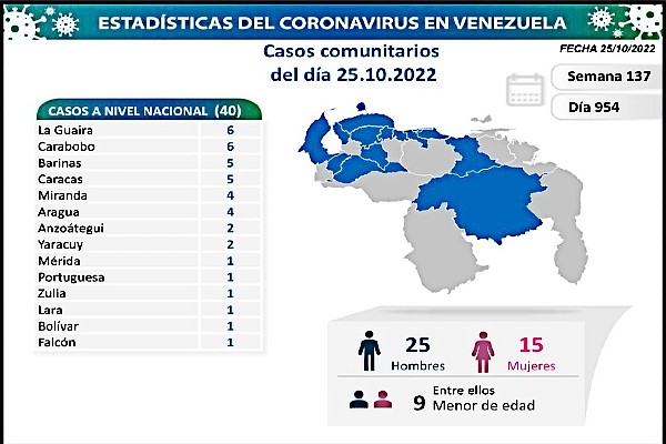 Informó que los casos comunitarios están ubicados en los estados: La Guaira (6), Carabobo (6), Barinas (5), Caracas (5), Miranda y Aragua (4 c/u), Anzoátegui y Yaracuy (2 c/u), Mérida, Portuguesa, Zulia, Lara, Bolíva y Facón (1 c/u).