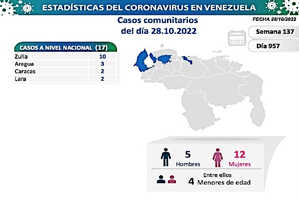 Con esta actualización, al día 957 de pandemia, Venezuela totaliza 545.803 casos confirmados. 690 son activos y 539.293 recuperados, lo que representa 99% de los contagios. De los activos, 50 están en hospitales, 46 en Centros de Diagnóstico Integral (CDI), 38 en clínicas privadas y 556 reciben atención comunitaria supervisada.