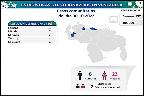 Detalló que los casos comunitarios están ubicados en los estados, Caracas (10), Mérida (7), Miranda (7), Yaracuy (4) y La Guaira (2).