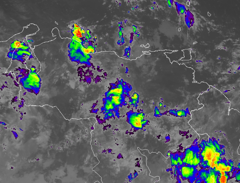 Para la tarde y noche se estiman núcleos convectivos generadores de lluvias fuertes con descargas eléctricas y eventuales ráfagas de viento, en áreas del Zulia, los Andes, Falcón, Centro Norte Costero, zona Insular, Nororiente, Delta Amacuro, Amazonas, Bolívar y el Esequibo.