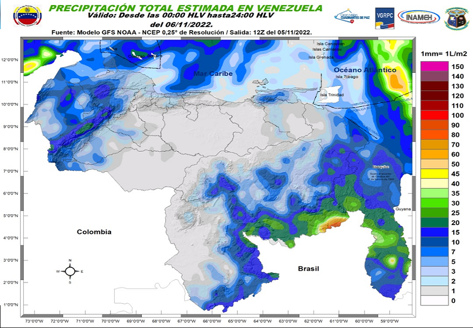 6 de noviembre de 2022.- De acuerdo al pronóstico del tiempo suministrado por el Instituto Nacional de Meteorología e Hidrología, INAMEH, para este día se esperan áreas nubladas con posibles precipitaciones, algunas con descargas eléctricas para el Zulia, los Andes, Falcón, Lara, Miranda, Llanos Occidentales, Sucre, Anzoátegui, Delta Amacuro, Amazonas y Bolívar; el resto del país se mantendrá con intervalos nubosos y probables lluvias o lloviznas aisladas.