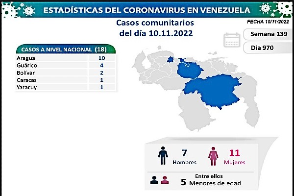 Informó que los casos comunitarios están ubicados en los estados: Aragua (10), Guárico (4), Bolívar (2), Caracas (1) y Yaracuy (1).