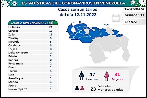 Informó que los casos comunitarios fueron ubicados en los siguientes estados: La Guaira (21), Caracas (13), Zulia (13), Yaracuy y Miranda con (5 c/u), Carabobo y Trujillo con (3 c/u), Delta Amacuro, Falcón, Barinas y Portuguesa con (2 c/u) y Guárico, Táchira, Lara, Anzo+ategui, Mérida, Apure y Nueva Esparta con (1 c/u).