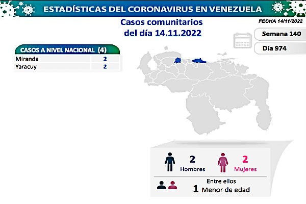 Indicó que los 4 casos comunitarios están ubicados en los siguientes estados: Miranda y Yaracuy con dos casos. De los cuales dos son hombres y dos mujeres, entre ellos un menor de edad.