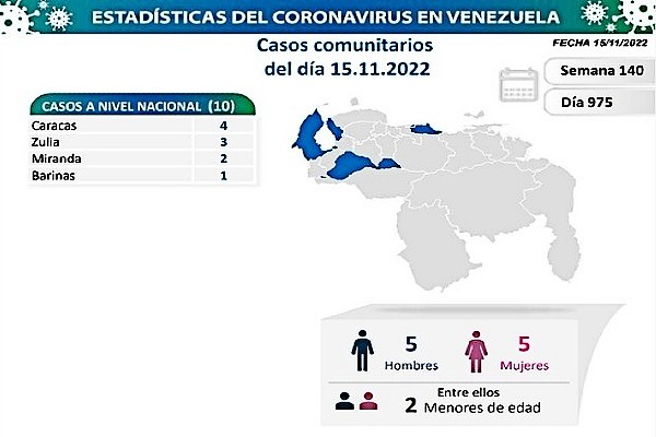 Este martes 15 de noviembre, Venezuela completó el día 975 de pandemia de la covid-19. El vicepresidente sectorial de Comunicación, Cultura y Turismo, Freddy Ñáñez, informó la mañana de este jueves a través de su cuenta en Twitter, que en las últimas 24 horas el país registró 28 nuevos casos, 10 comunitarios y 18 importados.