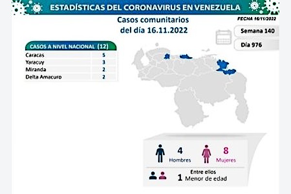 informó que los doce casos comunitarios están ubicados en: Caracas 5, Yaracuy 3, Miranda 2 y Delta Amacuro 2, de los cuales son 8 mujeres y 4 hombres, incluyendo a un menor de edad. Siendo Caracas la entidad con mayor número de contagios con casos en 5 de sus 22 parroquias. especificamente Antímano 1, El Valle 1, Macarao 1, San Pedro 1 y Santa Rosalía 1.