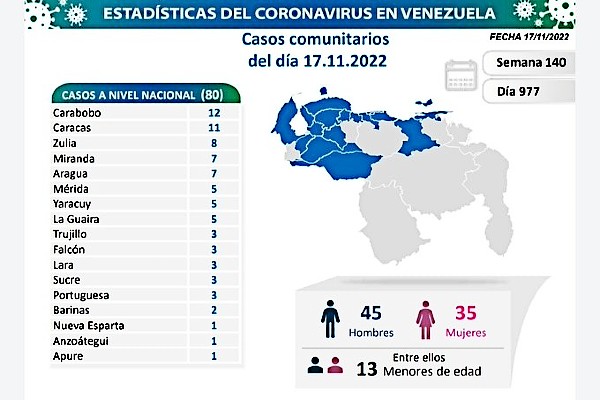 Los 80 casos comunitarios están ubicados en: Carabobo 12, Caracas 11, Zulia 8, Miranda 7, Aragua 7, Mérida, Yaracuy y La Guaira con 5 c/u, Trujillo, Falcón, Lara, Sucre, y Portuguesa con 3 c/u, Barinas 2, Nueva Esparta, Anzoátegui y Apure con 1 solo caso c/u.