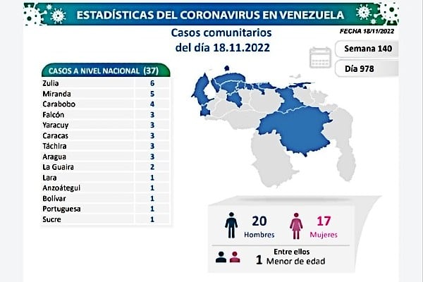 Ñáñez, señaló que los 37 casos comunitarios están ubicados en los siguientes estados: Zulia 6, Miranda 5, Carabobo 4, Falcón 3, Yaracuy, Táchira, Caracas y Aragua con 3 c/u, La Guaira 2 y finalmente Lara, Anzoátegui, Bolívar, Portuguesa y Sucre con 1 c/u.