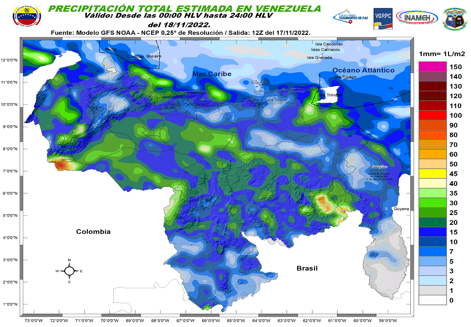 19 de noviembre de 2022.- De acuerdo al pronóstico del tiempo suministrado por el Instituto Nacional de Meteorología e Hidrología, INAMEH, se prevé nubosidad convectiva productora de precipitaciones de intensidad variable, algunos con descargas eléctricas en gran parte del territorio nacional, siendo mas intensas y frecuentes; en áreas del Zulia, los Andes, Llanos Centrales, Distrito Capital, Miranda, Anzoátegui, Sucre, Monagas, Delta Amacuro, Amazonas y Bolívar.