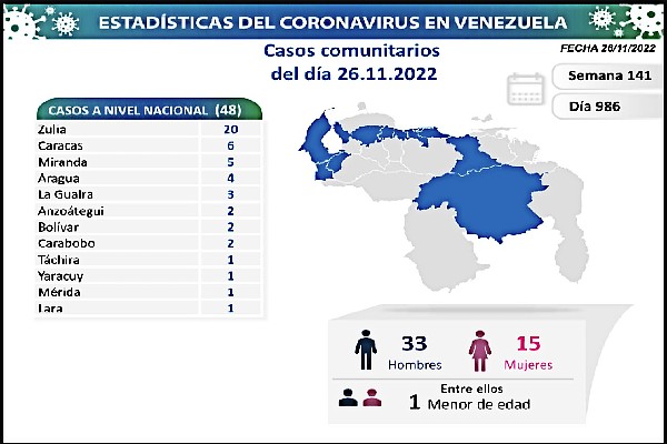 Informó que los 48 casos comunitarios están ubicados en: Zulia (20), Caracas (6), Miranda (5), Aragua (4), La Guaira (3), Anzoátegui, Bolívar y Carabobo con (2 c/u) y Táchira, Yaracuy, Mérida y Lara con (1 c/u.).