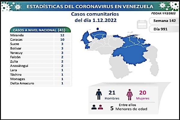 La vicepresidenta de la República, Delcy Rodríguez, indicó a través de su cuenta en Twitter, que el estado que registra el mayor número de nuevos casos comunitarios es Miranda (12), con contagios activos en 6 municipios, le siguen las entidades: Caracas (10), Sucre, Bolívar y Yaracuy con 3 c/u, Falcón, Zulia y Anzoátegui con 2 c/u y Lara, Táchira, Monágas y Delta Amacuro con 1 c/u.