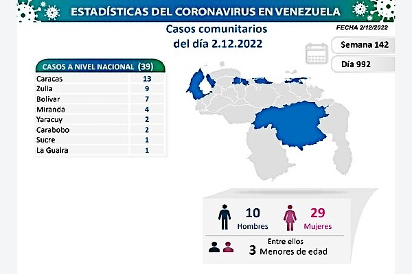 A 992 días de la pandemia en Venezuela, este viernes 02 de diciembre, el país registró 62 nuevos contagios de COVID-19: 39 casos comunitarios, 27 importados y un fallecido, informó el ministro de Comunicación e Información, Freddy Ñáñez, en su cuenta de la red social Twitter.
